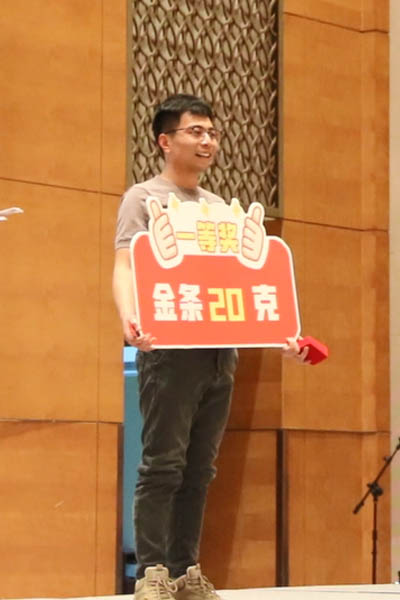 隨著三等獎(jiǎng)的抽出,晚會(huì)氣氛達(dá)到一個(gè)小高潮。幸運(yùn)兒們滿(mǎn)心歡喜地領(lǐng)取了獎(jiǎng)品5克金條。